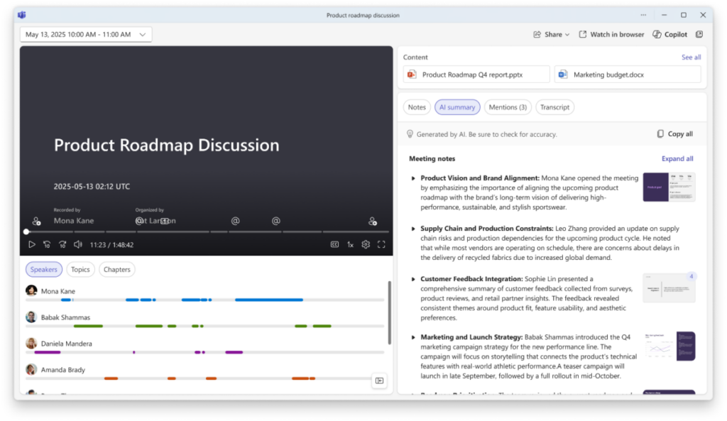 Du côté de l’IA, les récapitulatifs de réunions générés par Copilot gagnent en intelligence : ils intègrent désormais des références visuelles aux écrans partagés pendant les réunions enregistrées, plaçant les images clés aux bons endroits du résumé. Les utilisateurs avec une licence Microsoft 365 Copilot peuvent aussi personnaliser les templates de ces récaps, en choisissant des formats prédéfinis ou en demandant à Copilot d’adapter le ton et la structure à leurs habitudes. Cela rend les notes post-réunion plus rapides à consulter et plus utiles, sans devoir revoir l’enregistrement entier.